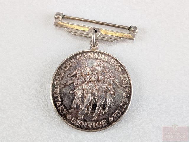 Médaille militaire du Service volontaire canadien en argent, montée sur une broche, datant de la deuxième guerre mondiale et mesurant 2 pouces de hauteur