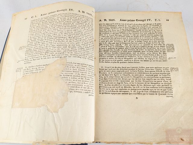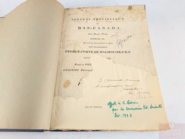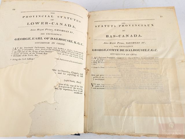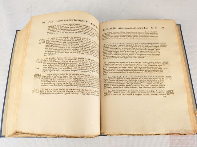 Lot # 122 - Livre Les statuts provinciaux du Bas-Canada en anglais et français, imprimé en 1820-1821 et mesurant 11.5 pouces de hauteur