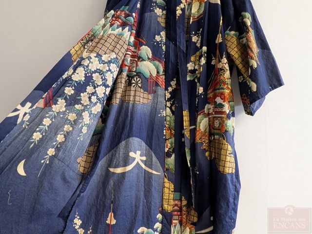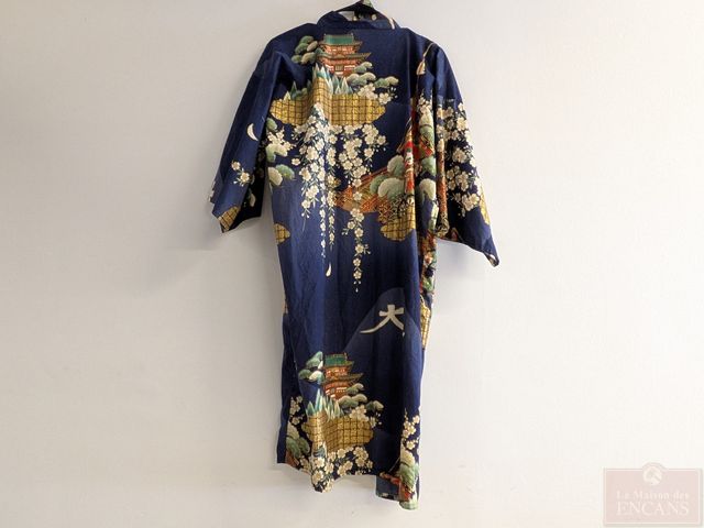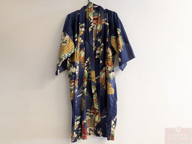 Kimono en coton richement détaillé, fait au Japon et mesurant 42 pouces de hauteur, avec sa ceinture