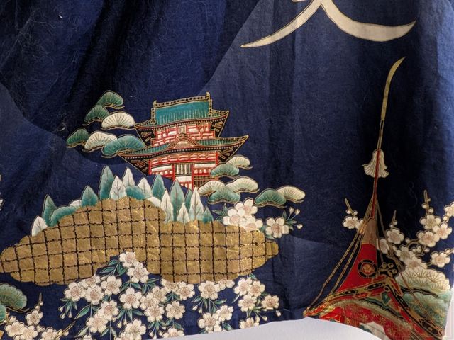 Lot # 159 - Kimono en coton richement détaillé, fait au Japon et mesurant 42 pouces de hauteur, avec sa ceinture