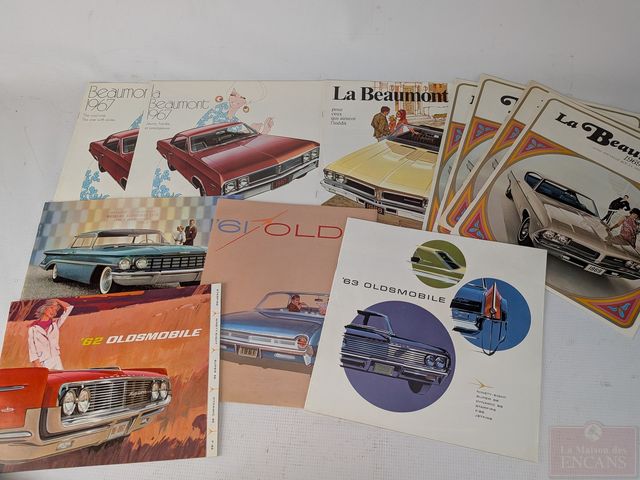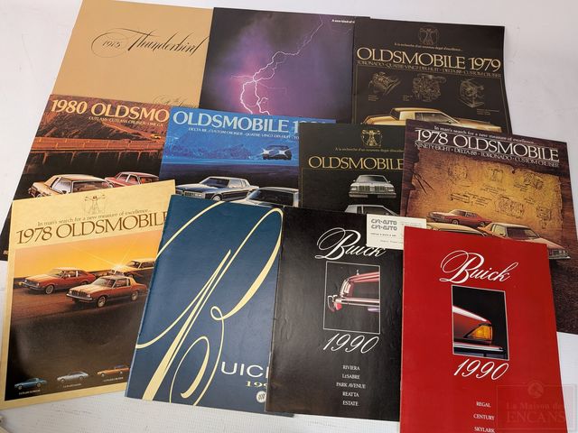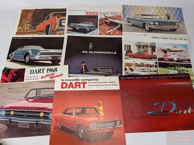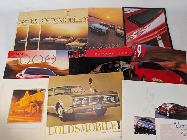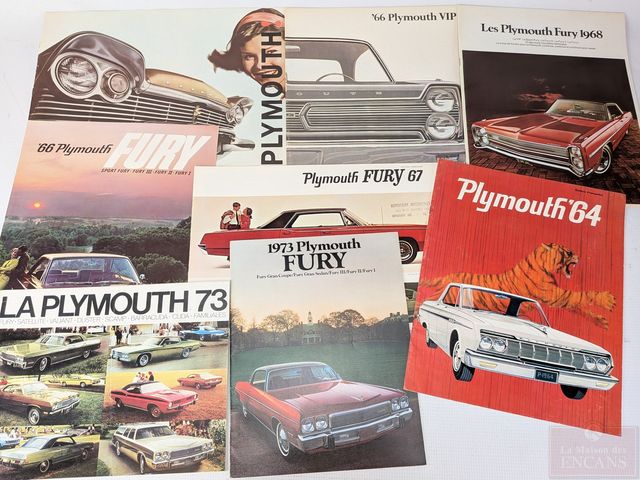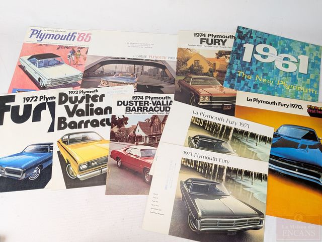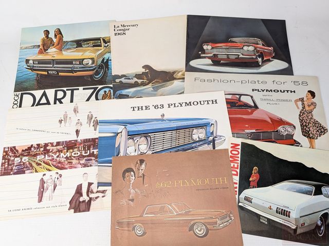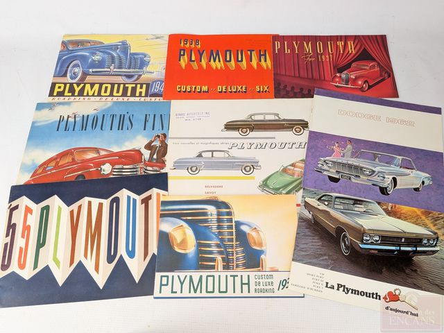 Gros lot de dépliants automobiles vintages, comprenant plusieurs Plymouth lithographiées datant des années 1930-1950, Chrysler, Dodge, Jeep, Jeep Grand Cherokee 2008, Ford, Pontiac Aztec 2001, Pontiac Grand Arme 2001, Chevrolet Cavalier 2001, Mercury Capri, Jeep 1980, Buick, Intrigue Oldsmobile et autres